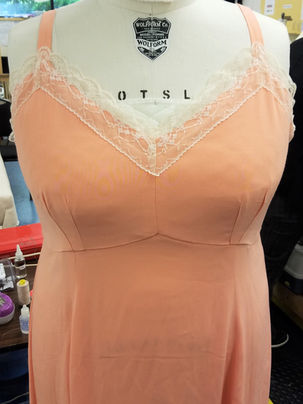 Task: Stitcher - Billie's slip is constructed out of pink stretch material, with the top piece lined with silk that was dyed to match. Lace was both machine and hand finished on the hemline and top edge. An invisible zipper was placed on the left side.